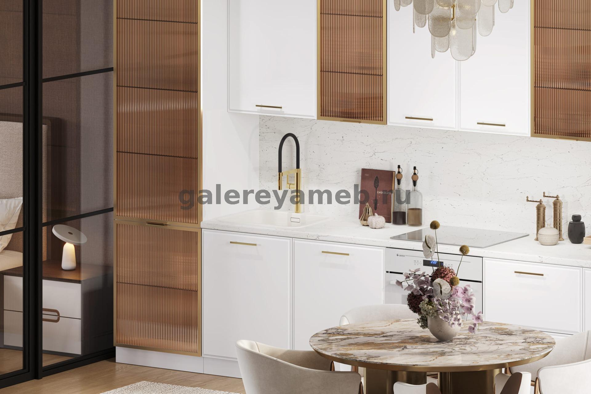 Кухня Мария 3 уровня, прямой 4,20 м Белый, Золото, Мрамор Милас