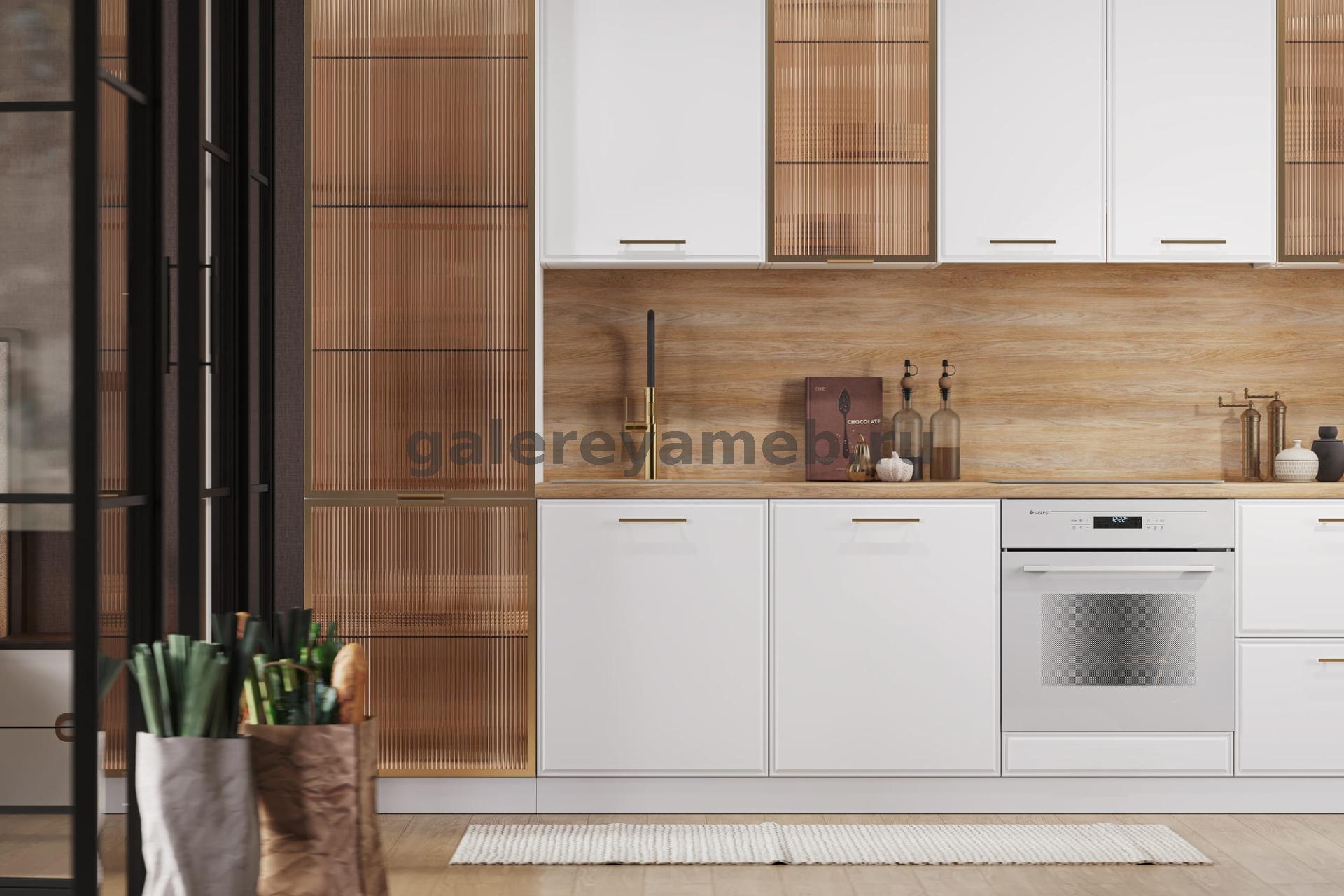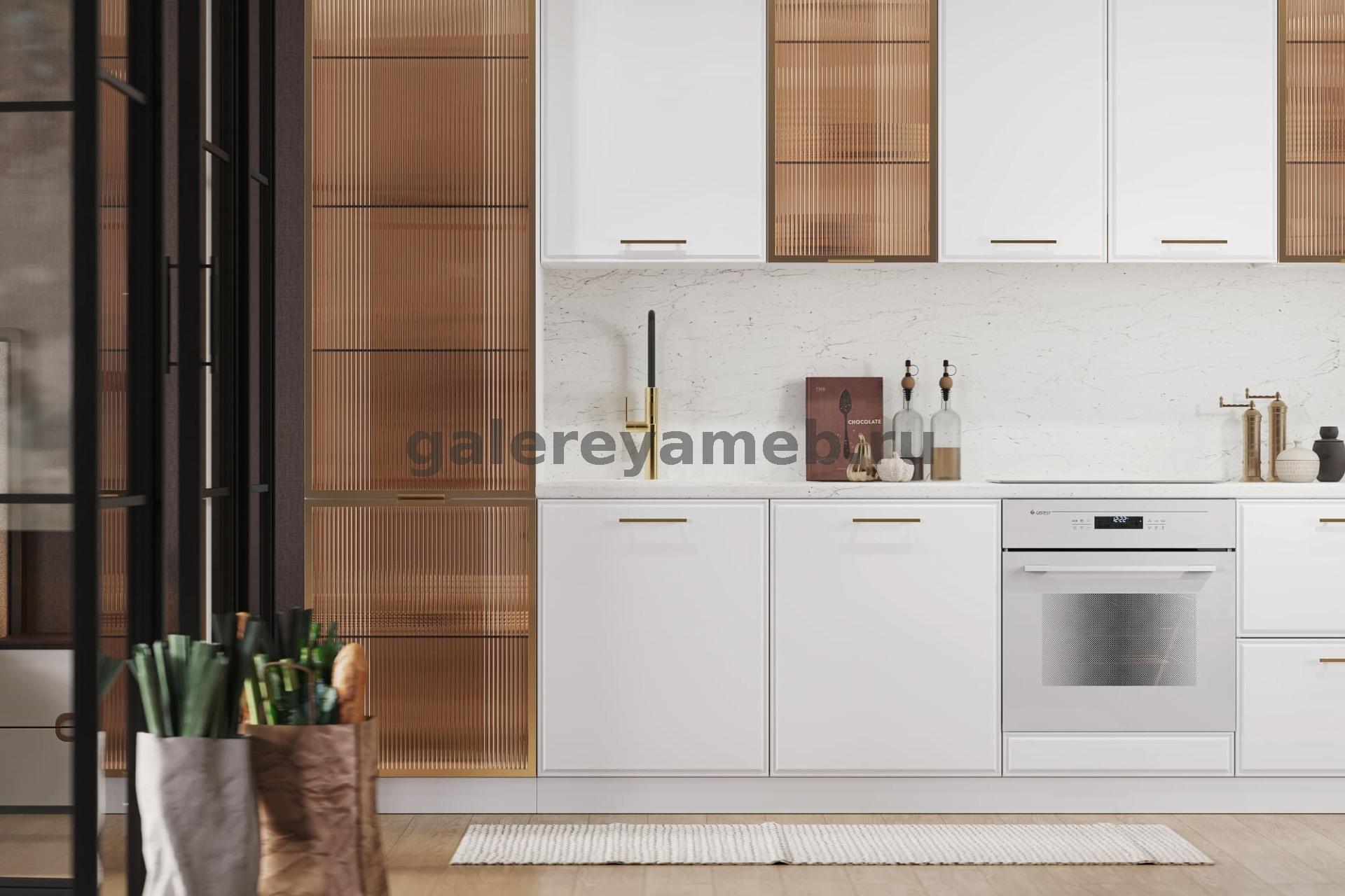 Фасад: МДФ толщиной 22 мм (МДФ - древесноволокнистая плита среднего уровня плотности, класс E1 - безопасен для здоровья). Алюминиевая рамка золотого цвета. Остекление - рифлёное стекло бронза, толщиной 4 мм. Все фасады проходят окраску эмалью и защитным лаком. Цвет фасада: белый, золото