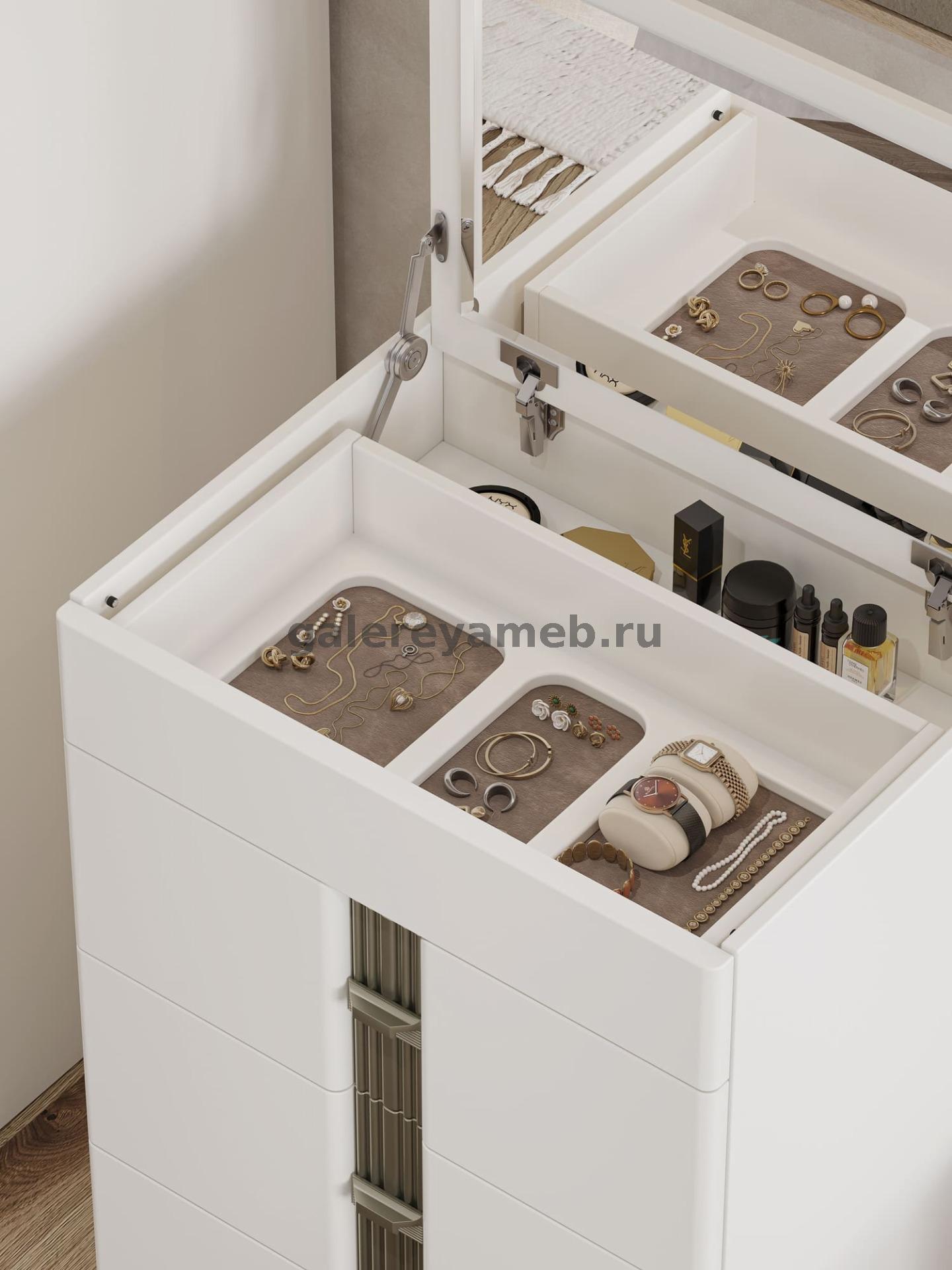 Комод Леонардо с выдвижными ящиками, откидной крышкой с зеркалом и разделителем для украшений — это продуманное сочетание функциональности и элегантности. Зеркало добавляет практичности для утренних сборов, а разделитель обеспечивает порядок для мелких вещей. Дизайн сохраняет лаконичные формы и изящный декор, гармонично вписываясь в коллекцию.