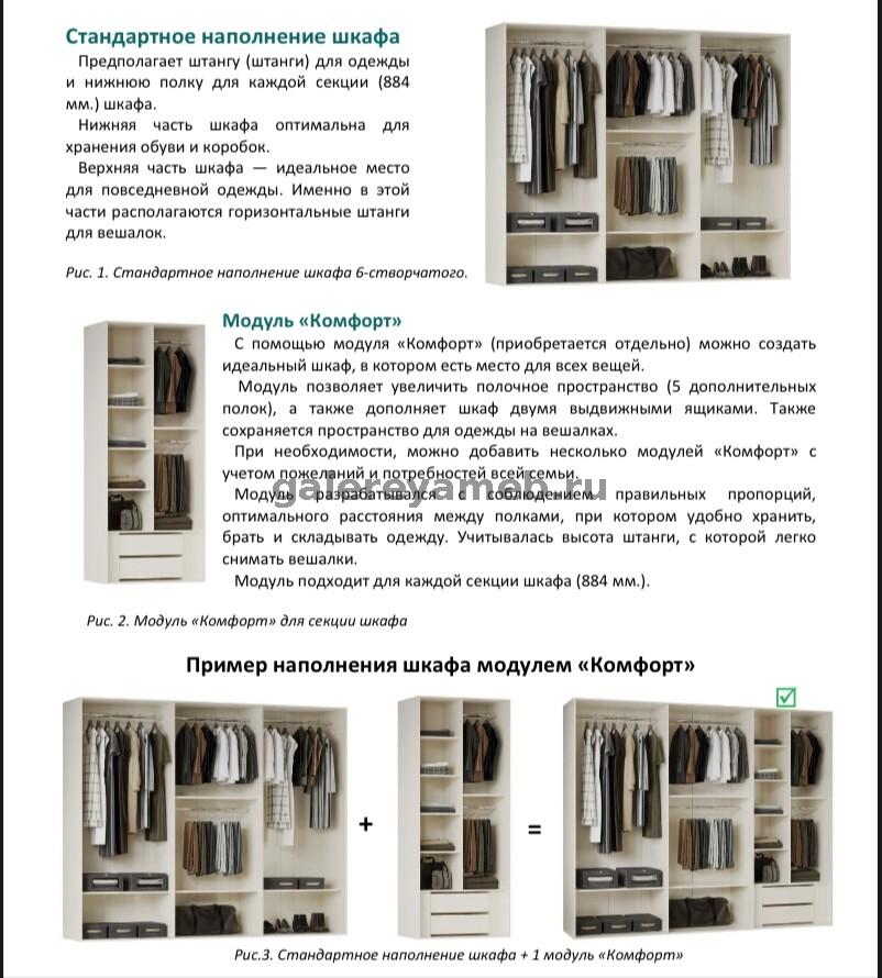Для шкафа идет наполнение "Комфорт", фото прилагается . Модуль наполнения для шкафа. В отличие от базового модуля увеличивает пространство для хранения в виде полок и выдвижных ящиков Размеры модуля (ш * г * в) мм. : 884 х 480 х 219
