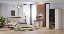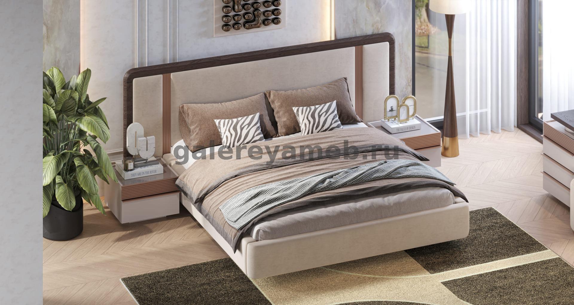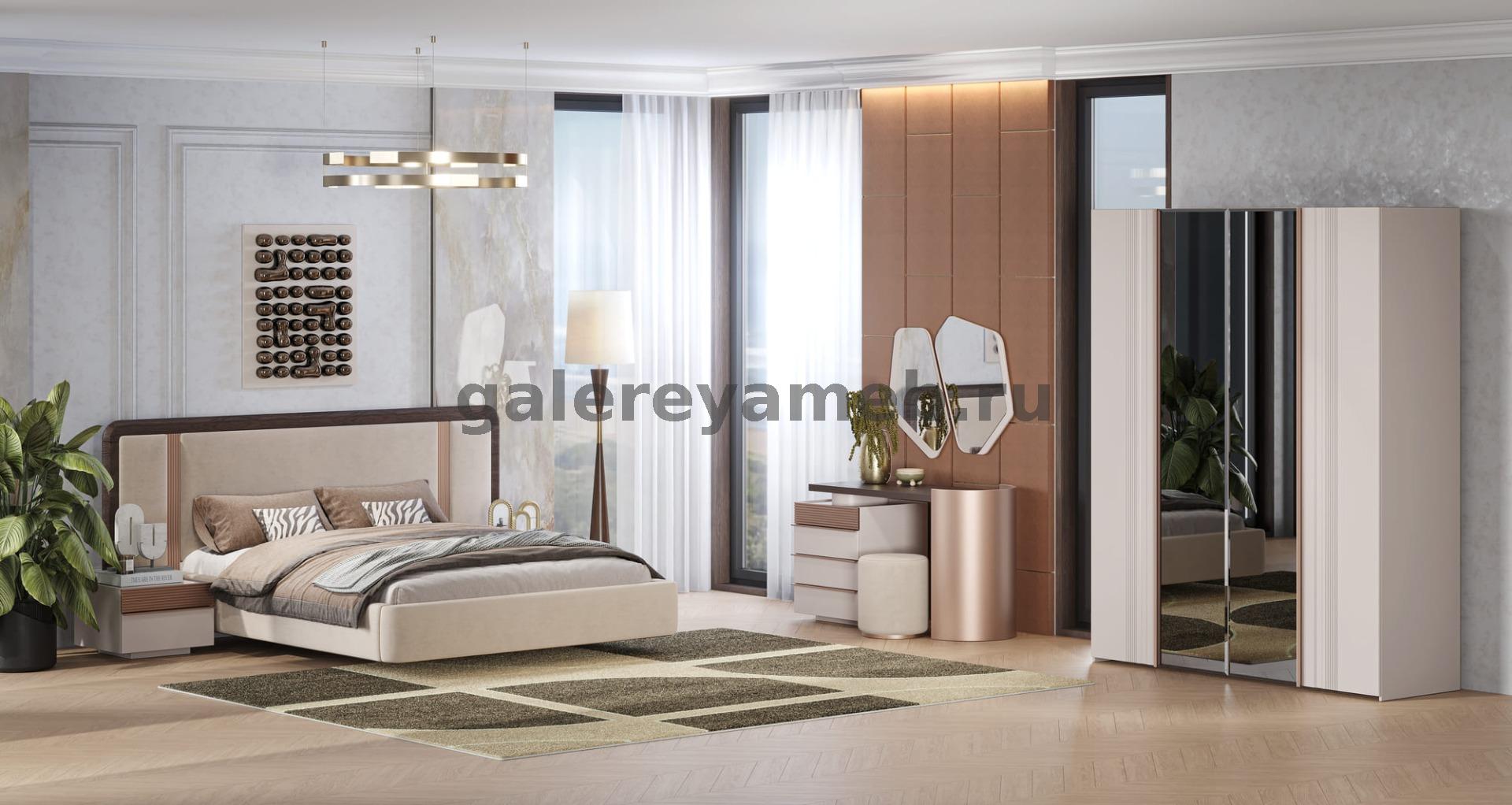 Спальня Мирелла кашемир, Дуб крафт табачный 3х дв. с зеркалом и подвесными тумбами, кровать 1,6м Мэри мебель